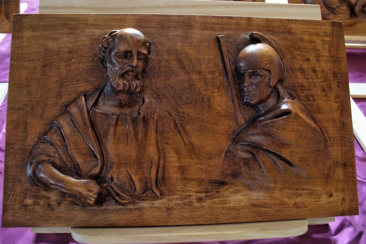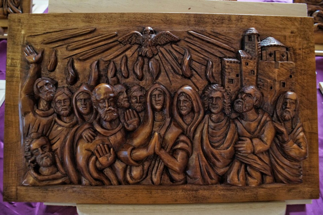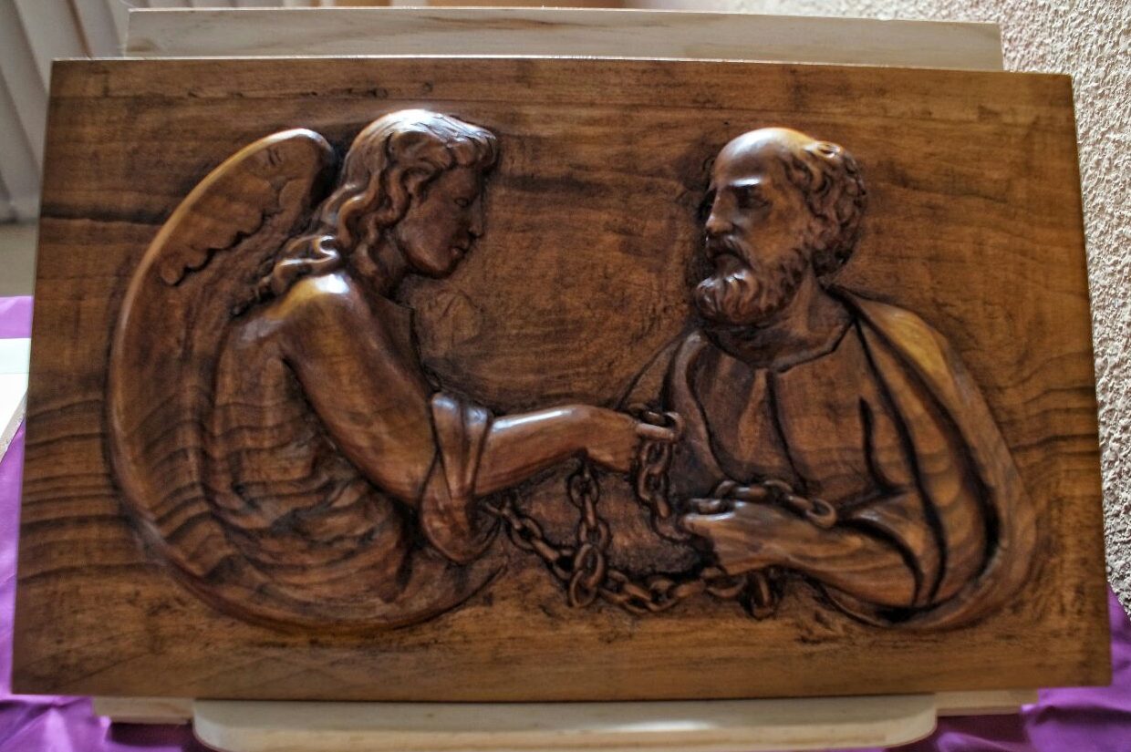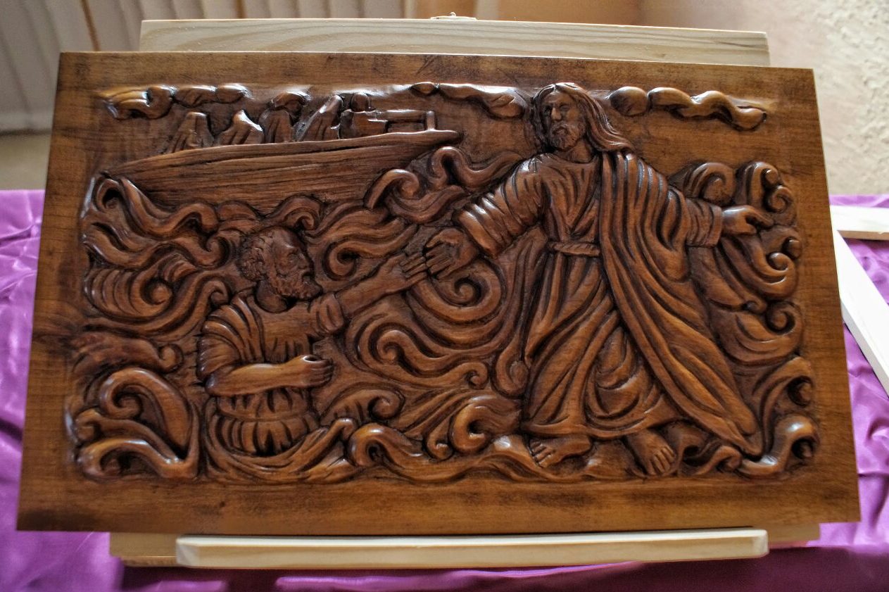 También obra del maestro artesano Tomás Bux, sobre tabla de cerezo español. Composición en base a dos personas, la figura de Jesús y la figura San Pedro como primer plano, donde muestra cómo Jesús salva a Pedro semihundido en las aguas; en un segundo plano un mar embravecido, y como tercer plano la barca con los apostales que les acompañaban.