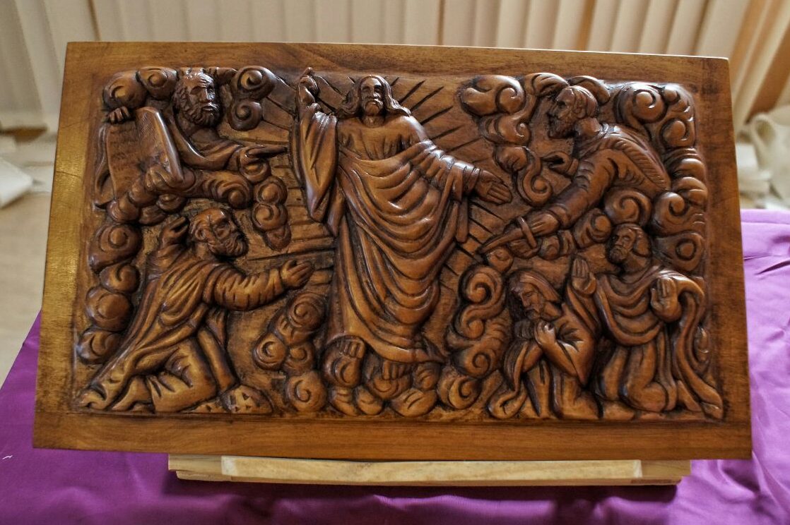 Obra de Tomás Bux sobre tabla de cerezo, La Composición en base a la figura de Jesús en primer plano como protagonista, vestido con túnica y manto que cae sobre sus brazos, desprendiendo un halo de luminosidad. En un segundo plano, debajo y a la izquierda san Pedro arrodillado dirigiendo su mirada a Jesús, y sobre él la representación de Moisés con las tablas de la Ley; debajo a la izquierda, Juan y Santiago arrodillados y sobre ellos, la representación de Elías. Toda la escena envuelta en nubes dando misterio a la iconografía que ocupa la escena.