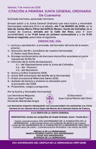 17:30 horas. JUNTA GENERAL ORDINARIA. «De Cuaresma«. SALA DE JUNTAS MARCO PÉREZ. Edificio Museo de la JdC, Piso 3º (entrada por la Calle del Peso).
