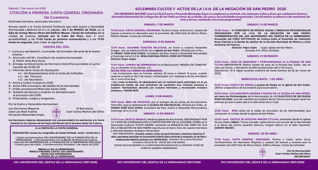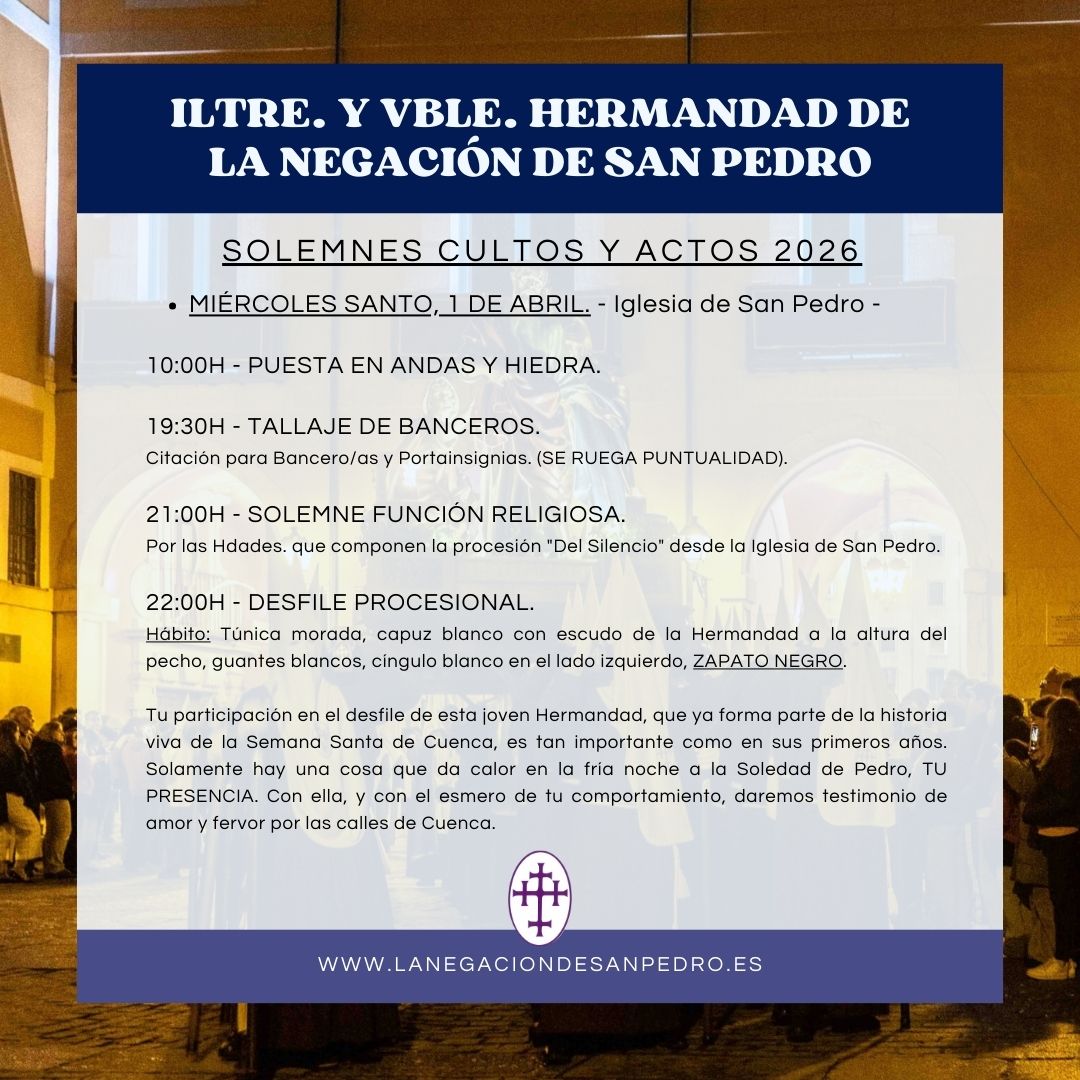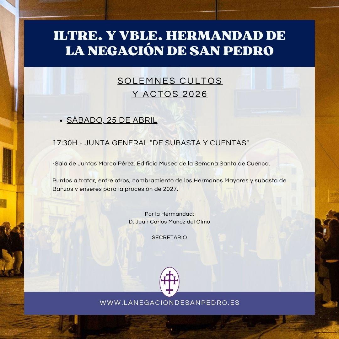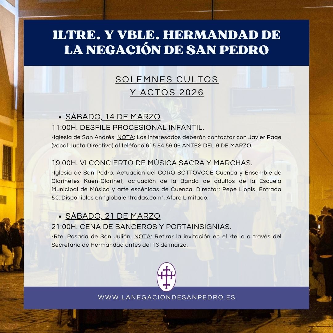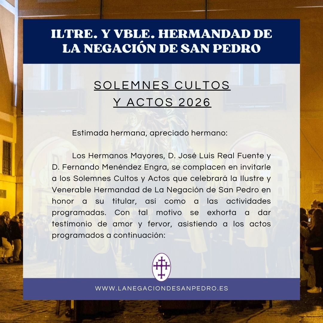 Los Hermanos Mayores, D. José Luis Real Fuente y D. Fernando Menéndez Engra, se complacen en invitarle a los Solemnes Cultos y Actos que celebrará la Ilustre y Venerable Hermandad de La Negación de San Pedro en honor a su titular, así como a las actividades programadas. Con tal motivo se exhorta a dar testimonio de amor y fervor, asistiendo a los actos programados a continuación: